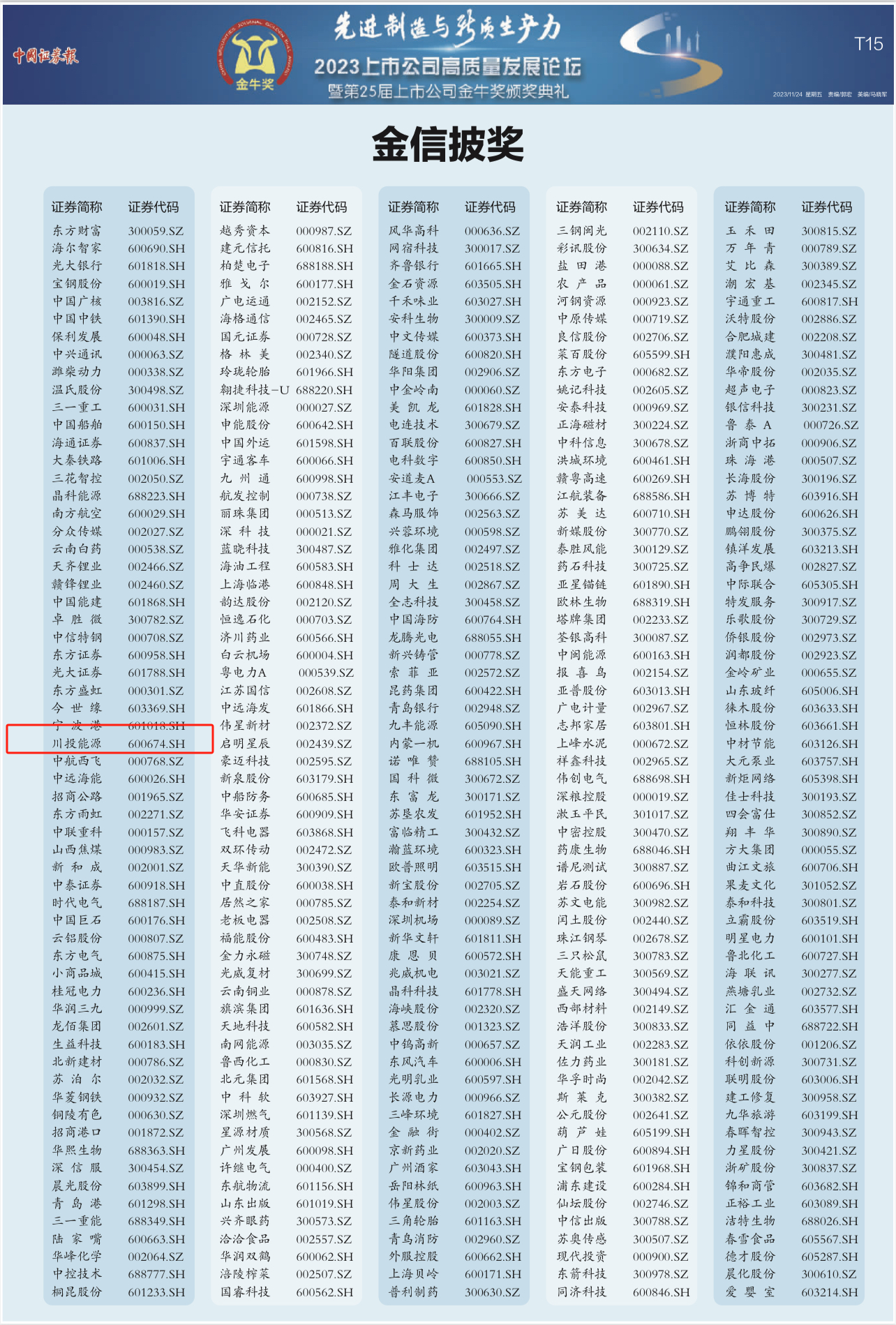 11月24日,由中國證券報(bào)主辦的“第二十五屆上市公司金牛獎(jiǎng)”榜單揭曉,川投能源憑借穩(wěn)健增長的業(yè)績、不斷提升的綜合實(shí)力和高質(zhì)量的信息披露,榮獲“2022年度金信披獎(jiǎng)”。
