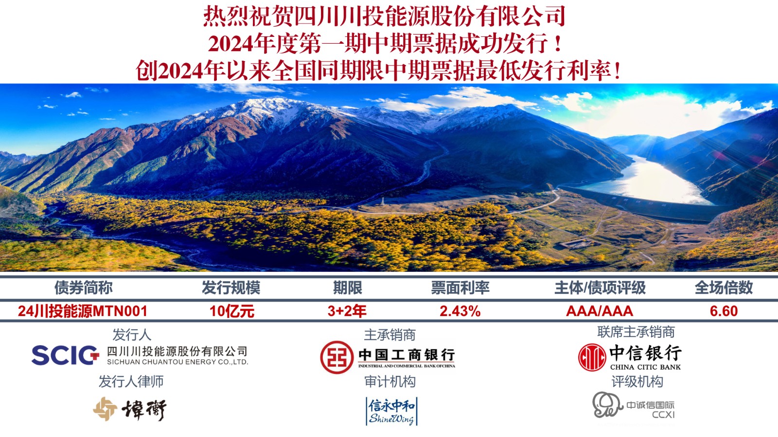 4月16日,川投能源搶抓資本市場有利時間窗口,成功發行2024年度第一期中期票據。本期中期票據發行規模為10億元,發行期限3+2年,發行利率2.43%,創2024年以來全國同期限中期票據最低發行利率,同時也創公司中長期債券歷史最低發行利率。