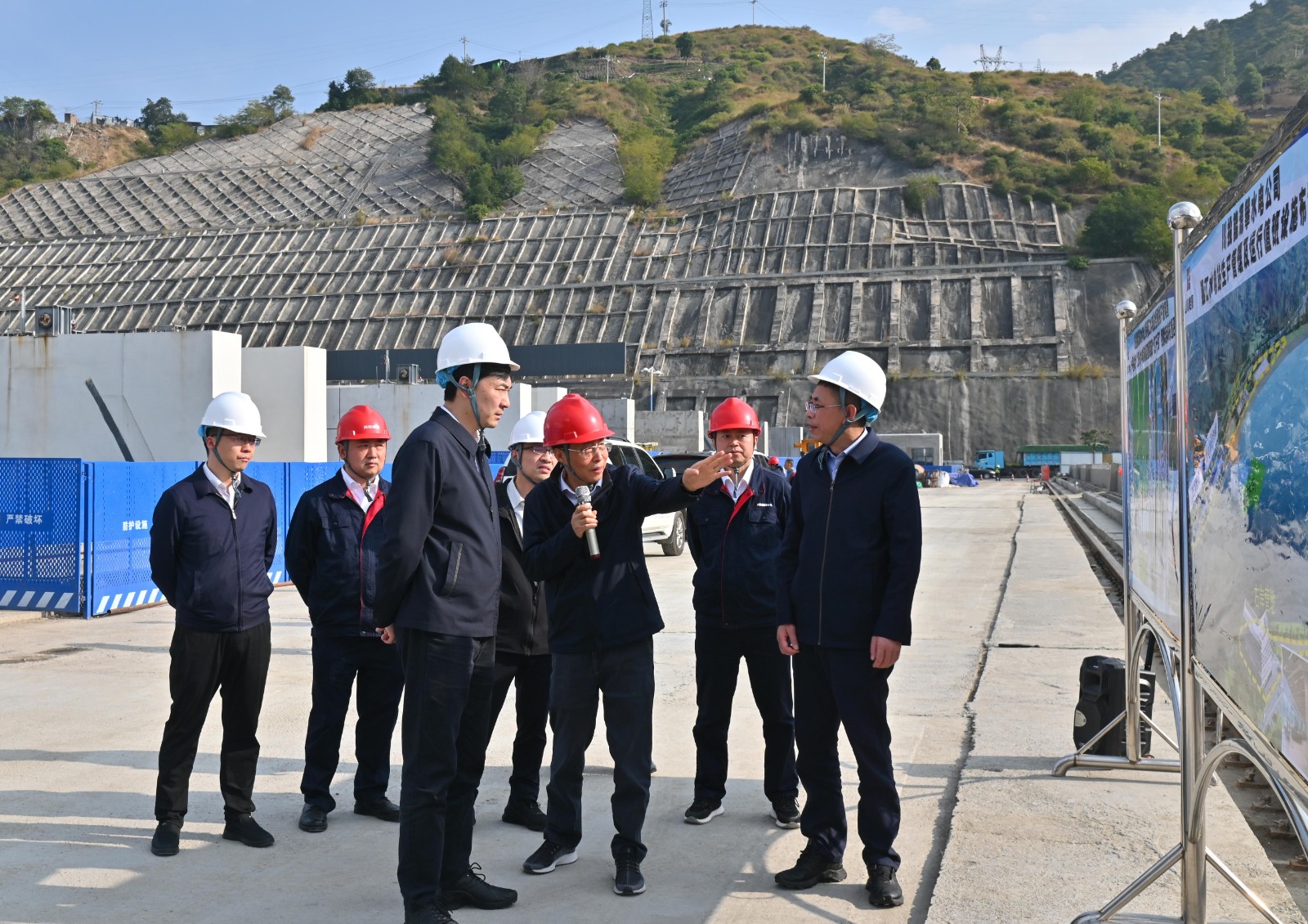 鄧超一行深入銀江水電站項目施工現場,實地查看了大壩壩頂、中控室、安裝間等區域安全生產情況,并現場聽取了攀水電公司關于工程建設、生產運行、安全環保等工作落實情況的匯報。